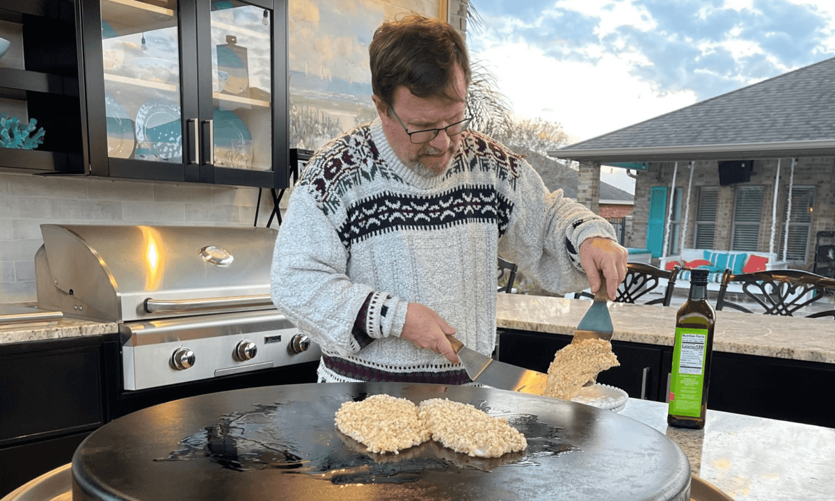 Macadamia Crusted Grouper in the Test Kitchen of Riviera Outdoor Décor. Our outdoor kitchens feel like coastal resort living, and are designed to handle salt air, real cooking and yes, even hurricanes