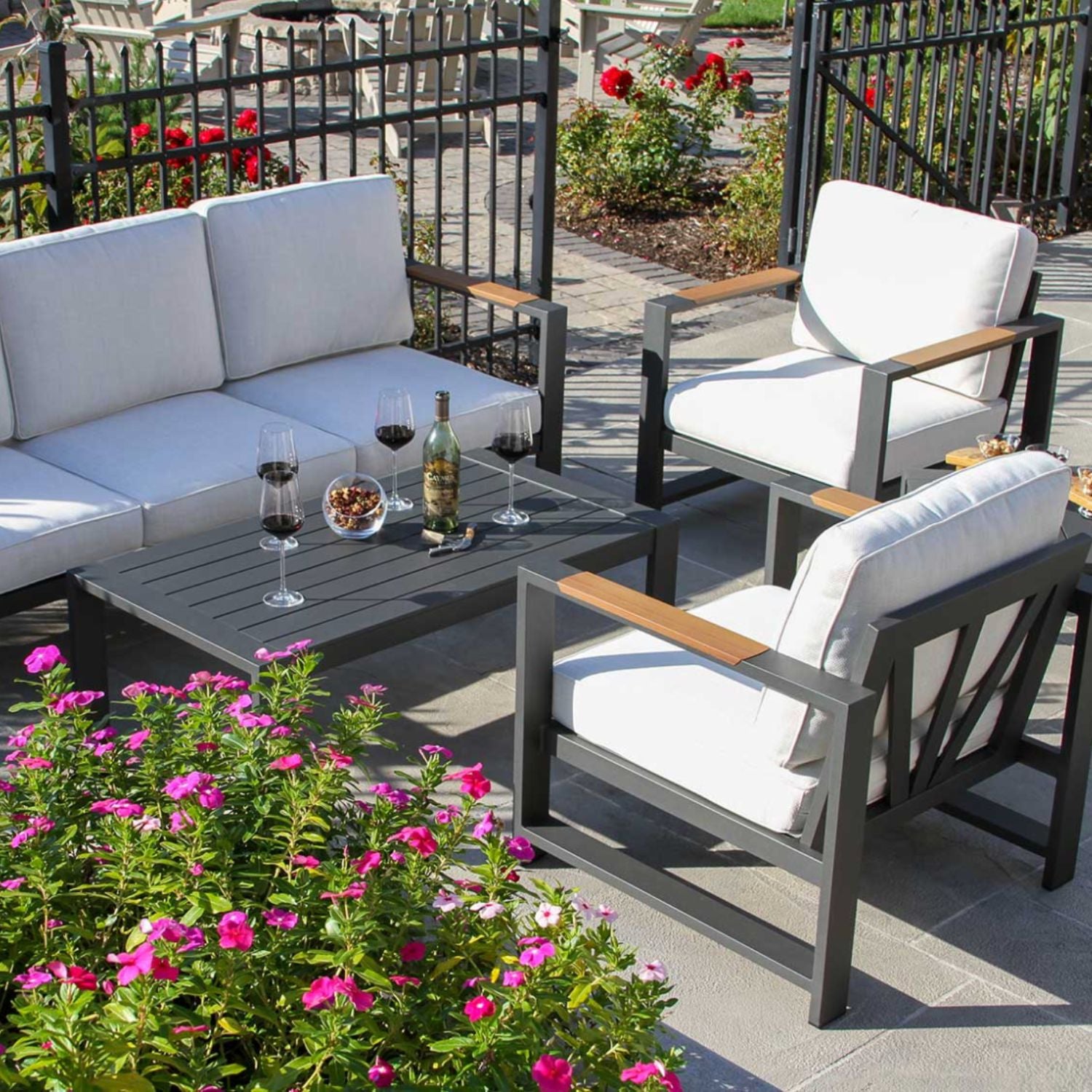 Opt for weather-resistant materials like teak, synthetic wicker or cast aluminum. These materials withstand moisture and resist decay over time.