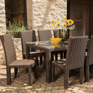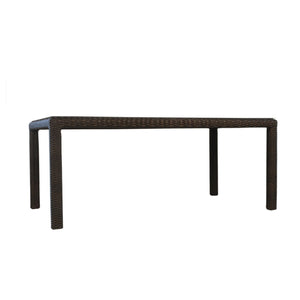 Woven Outdoor Rectangular Dining Table 73", from the Mesa Collection by Lloyd Flanders- the leader and gold standard in woven outdoor furniture for over 100 years. The Mesa outdoor dining table is characterized with bold contemporary lines and well placed transitions. This woven table is available in pecan vinyl with umbrella hole.
