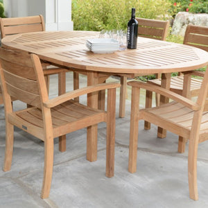 Round Outdoor Teak Table Extends 48"-&2", with butterfly leaf. From the Three Birds Chelsea Collection. The perfect table for people who have smaller living spaces but love to entertain. The extension or butterfly leaf allows the addition of two extra place settings when the table changes from a 4' round table to a 6' oval table.