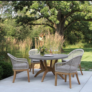 Beautiful, on-trend, round outdoor dining table set made to last with coordinating outdoor dining chairs in nautical grade rope in black or ash.