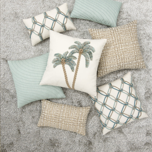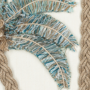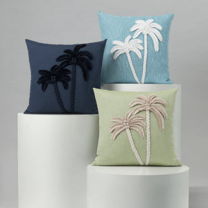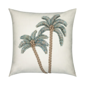 This pillow features an exquisite textured look in soft ivory. Hand created artisanal, 3-dimensional palm trees with braided trunks, hand knotted coconuts and fringed palm fronds complete the look.